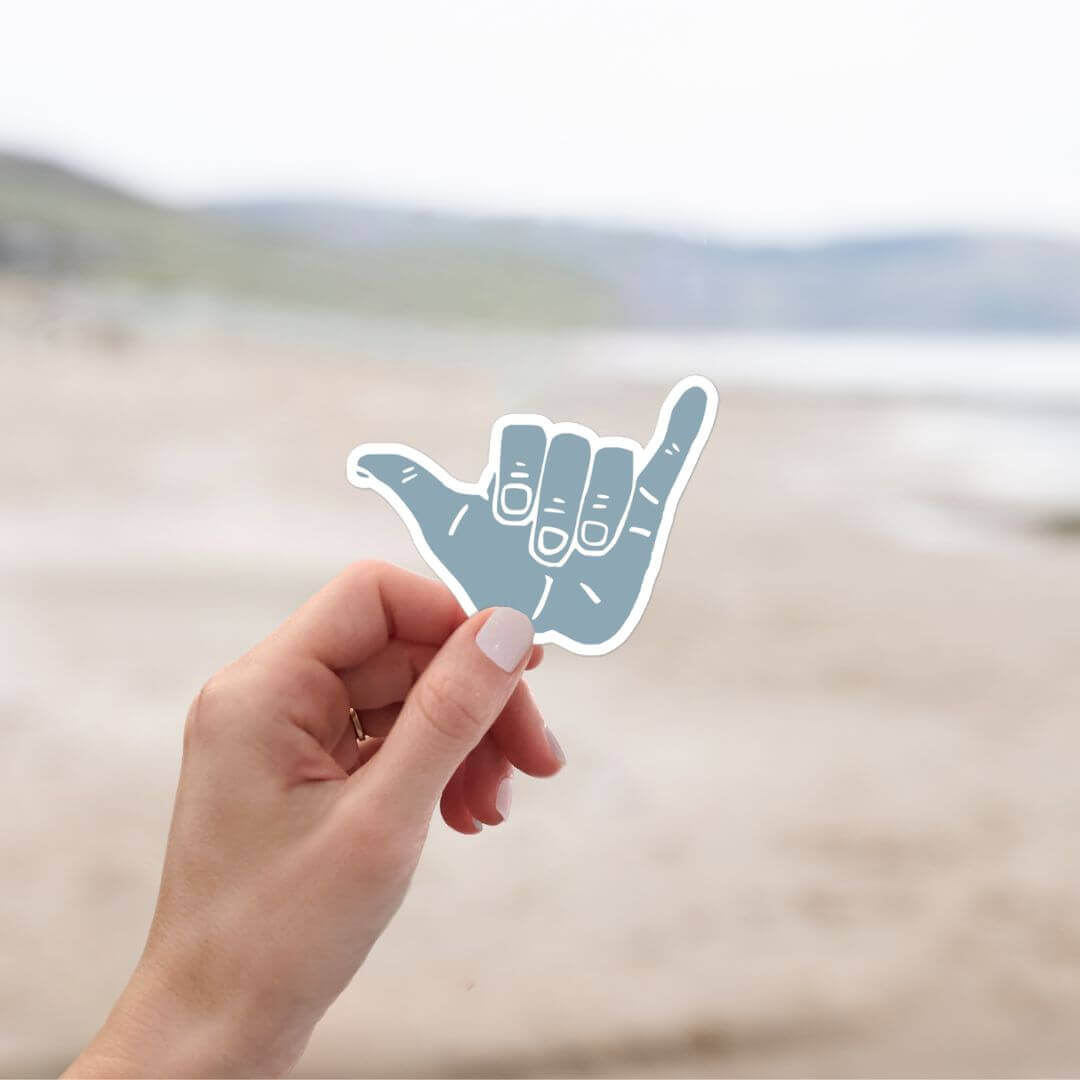 Bring a touch of surf culture to any surface with the Blue Shaka Surf Sticker. This playful sticker features a blue "shaka" hand gesture, making it a fun addition to any sticker collection. Perfect for adding personality to your laptop, water bottle, car or board.