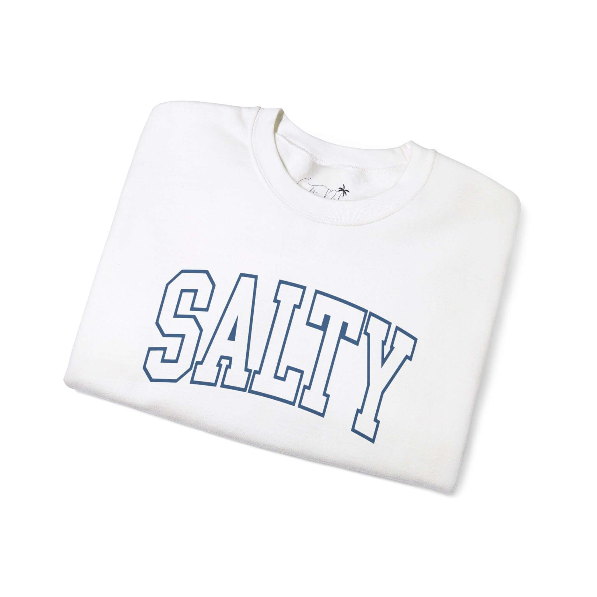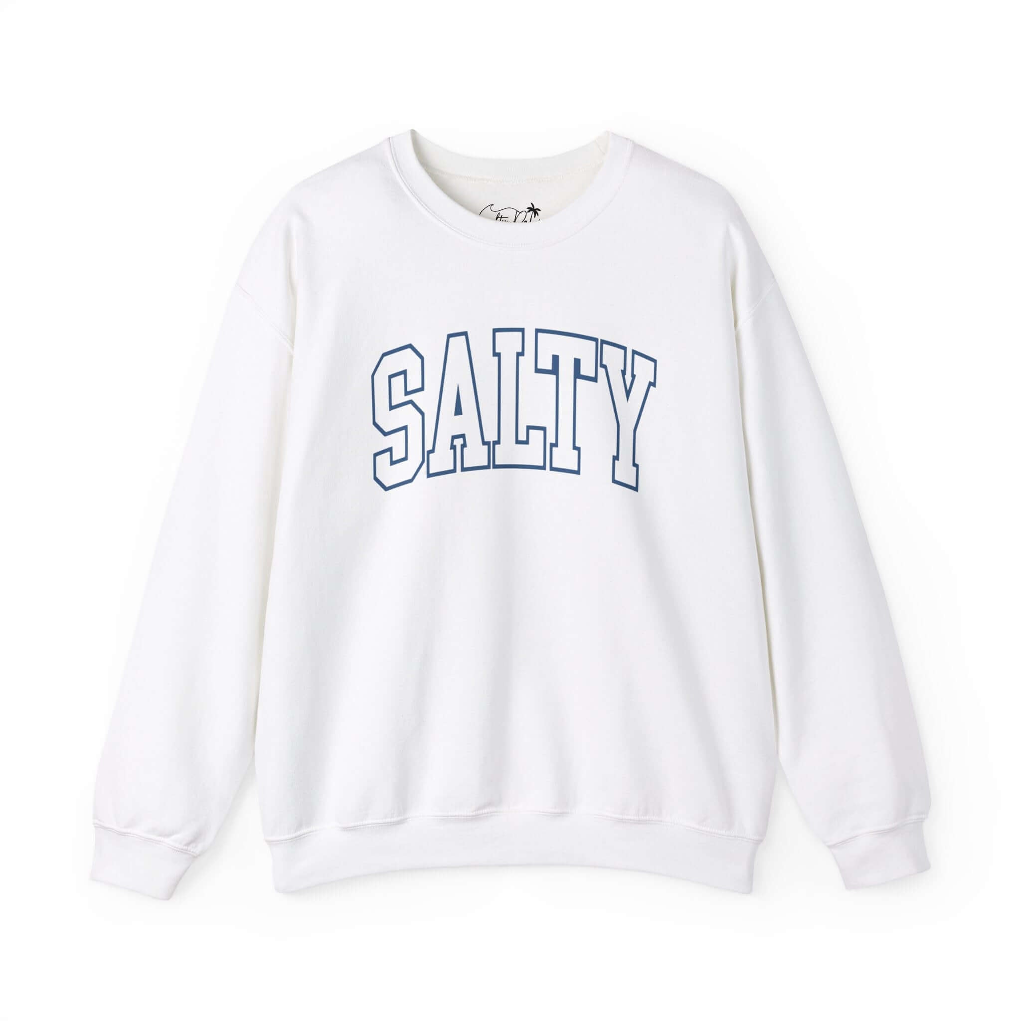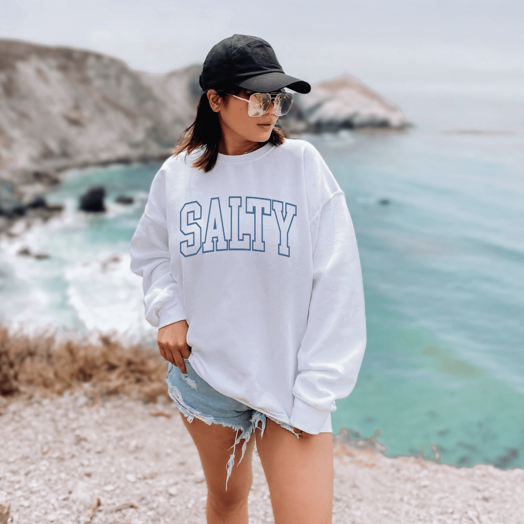 Embrace the salty spirit with this Salty Varsity White Crewneck Sweatshirt. Crafted for comfort and style, it features SALTY in bold varsity typography. It's perfect for casual beach days or cozy nights.